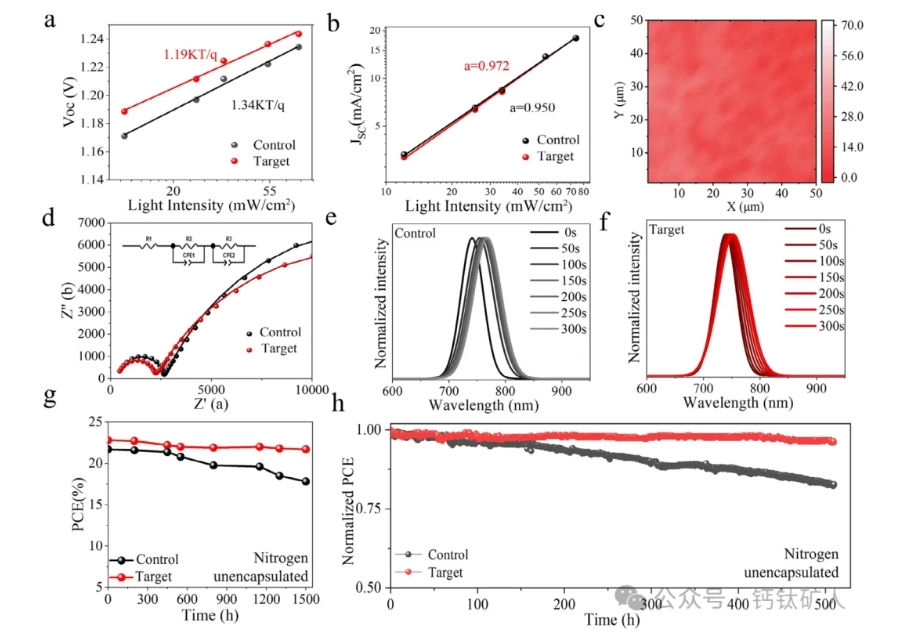 图5. 分析器件的工作机理和稳定性。a、b)器件的开路电压(VOC)和短路电流密度(JSC)的光强依赖性。c)从PL映射光谱提取的ΔQFLS。d)对照组和目标组的电化学阻抗谱(EIS)Nyquist图。e、f)光老化下对照组和目标组的时间依赖性PL光谱(5 mW,405 nm激光聚焦成3 μm2光斑尺寸)。g)装置在氮气储存中的长期稳定性测试。h)对照和目标装置在1个太阳照射下的最大功率点(MPP)跟踪。