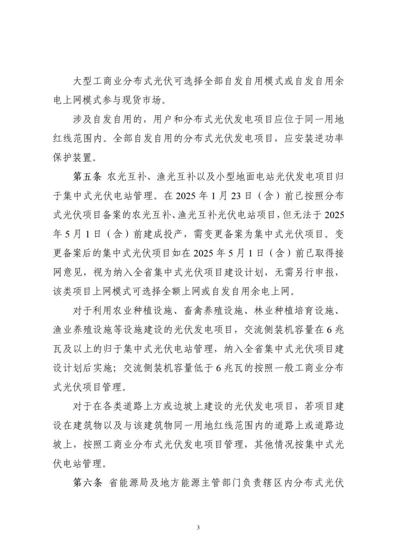 农光互补、渔光互补以及小型地面电站光伏发电项目归于集中式光伏电站管理。在2025年1月23日(含)前已按照分布式光伏项目备案的农光互补、渔光互补光伏电站项目,但无法于2025年5月1日(含)前建成投产,需变更备案为集中式光伏项目。变更备案后的集中式光伏项目如在2025年5月1日(含)前已取得接网意见,视为纳入全省集中式光伏项目建设计划,无需另行申报,该类项目上网模式可选择全额上网或自发自用余电上网。