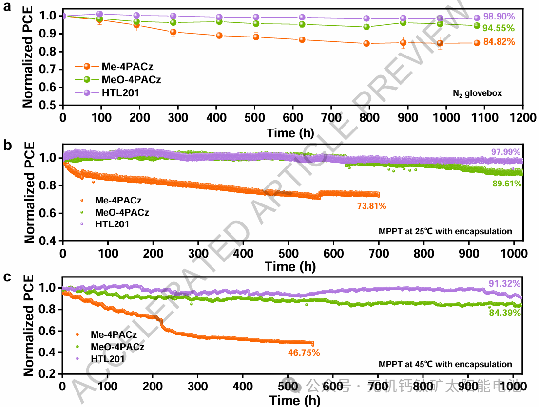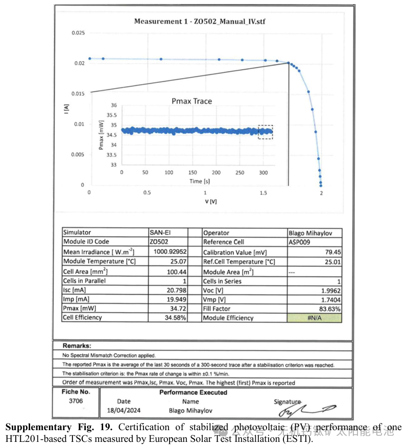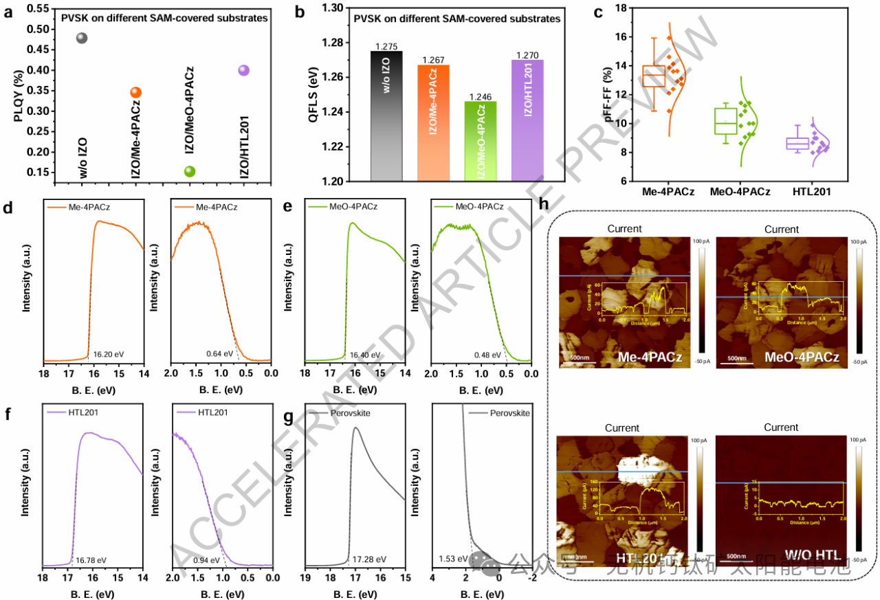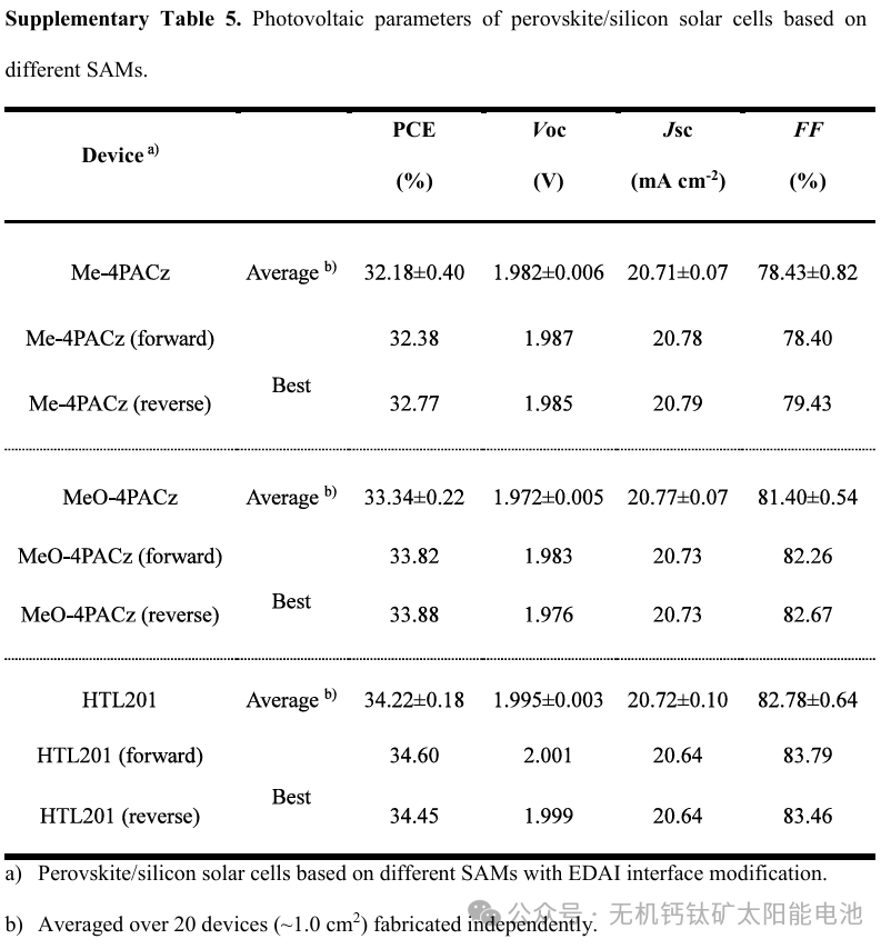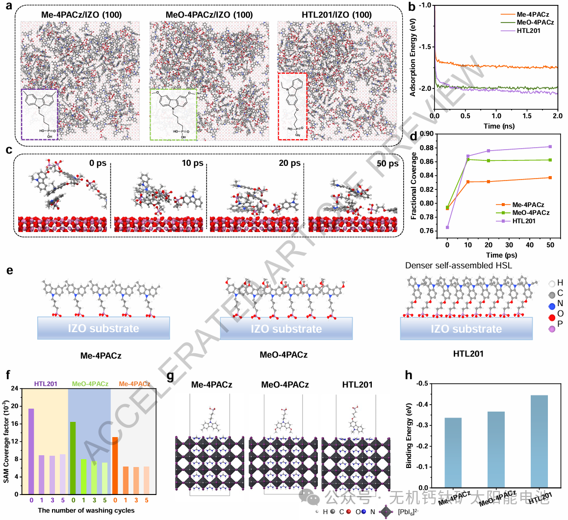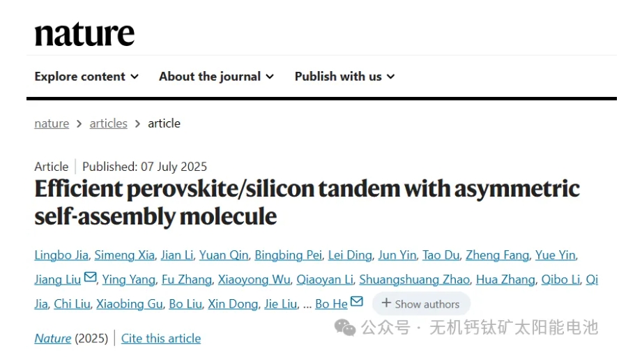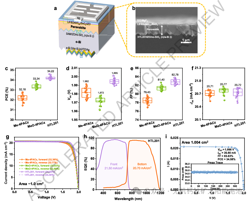 在纹理化硅衬底上实现具有最佳堆积构型的高度有序且均匀覆盖的自组装单分子层(SAMs),仍然是进一步提高钙钛矿/硅串联太阳能电池(TSCs)效率的一项关键挑战。鉴于此,2025年7月7日隆基何永才&李振国&徐希翔&何博&苏大刘江等于Nature发文,设计了一种不对称的自组装单分子层(命名为HTL201),其特点是在咔唑核心两侧分别连接有锚定基团和间隔基团,可作为钙钛矿/硅串联太阳能电池的空穴选择性层(HSL)。与带有氮键合膦酸基团的对称自组装单分子层相比,HTL201分子在透明导电氧化物(TCO)复合层上表现出最小的空间位阻和更好的覆盖度。HTL201与钙钛矿薄膜之间的强配位相互作用,有效减少了掩埋界面处的非辐射复合。值得注意的是,钙钛矿与HTL201之间实现了优化的能级排列,同时钙钛矿层的准费米能级分裂(QFLS)值增加,使得钙钛矿/硅串联太阳能电池能够实现近2 V的出色电压,基于硅异质结(SHJ)太阳能电池,其认证的功率转换效率(PCE)高达34.58%。