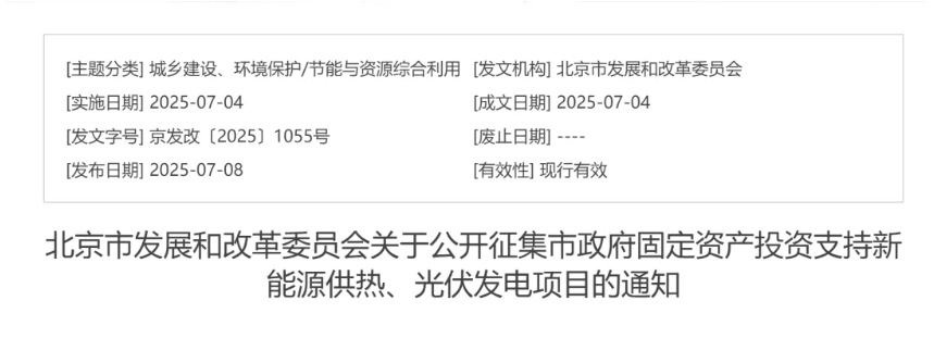 按照《关于印发全面推进新能源供热高质量发展实施意见的通知》(京发改〔2023〕1309号)、《关于印发推进光伏发电高质量发展支持政策的通知》(京发改规〔2023〕4号)等文件要求,现组织开展2025年第二批市政府固定资产投资新能源供热、光伏发电项目公开征集工作,并就有关事项通知如下: