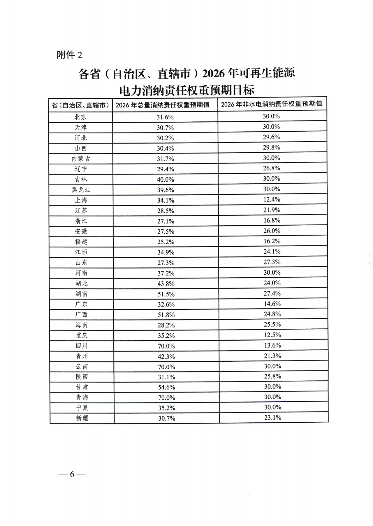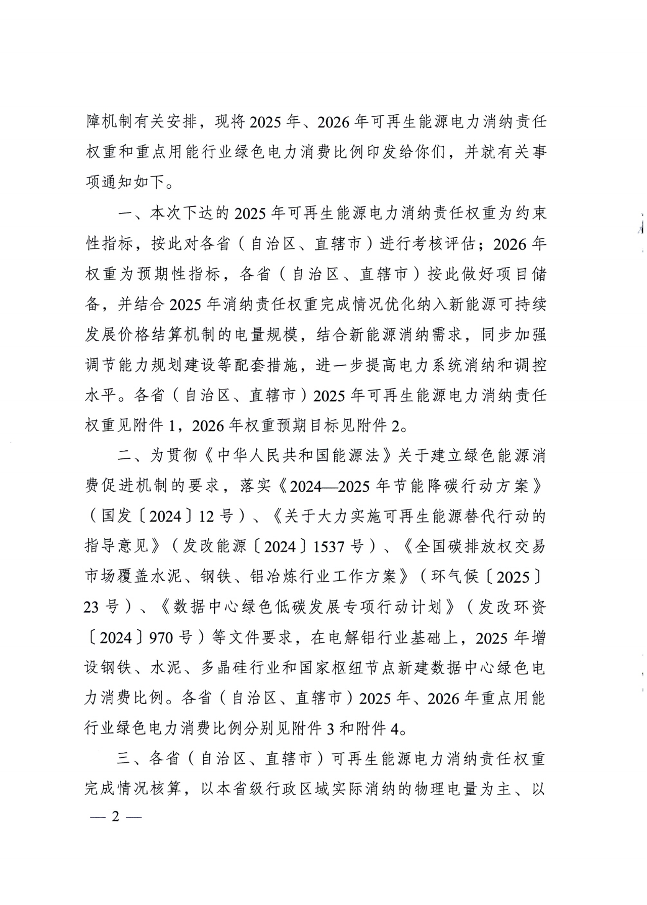 国家发改委、国家能源局印发《关于2025年可再生能源电力消纳责任权重及有关事项的通知》,下发2025年、2026年可再生能源电力消纳责任权重和重点用能行业绿色电力消费比例。