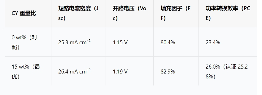 缺陷钝化:CY 的 Lewis 碱官能团与未配位 Pb 结合,减少陷阱态,抑制复合(非辐射复合损失 ΔVocⁿᵒⁿʳᵃᵈ降至 42.6 mV)。