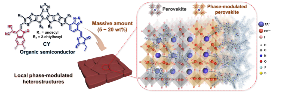 同时实现有效的缺陷钝化和优异的电荷提取能够最大化钙钛矿太阳能电池(PSCs)的功率转换效率(PCE)。与先前已有的基于异质结的 PSCs 不同,韩国蔚山国立科学技术院&高丽大学研究团队引入一种全新的局域相位调制异质结构,它能够对 PSCs 产生上述效果。在该结构中,我们将大量新开发的有机半导体(CY 分子)掺入整个钙钛矿晶格以及其表面和晶界。