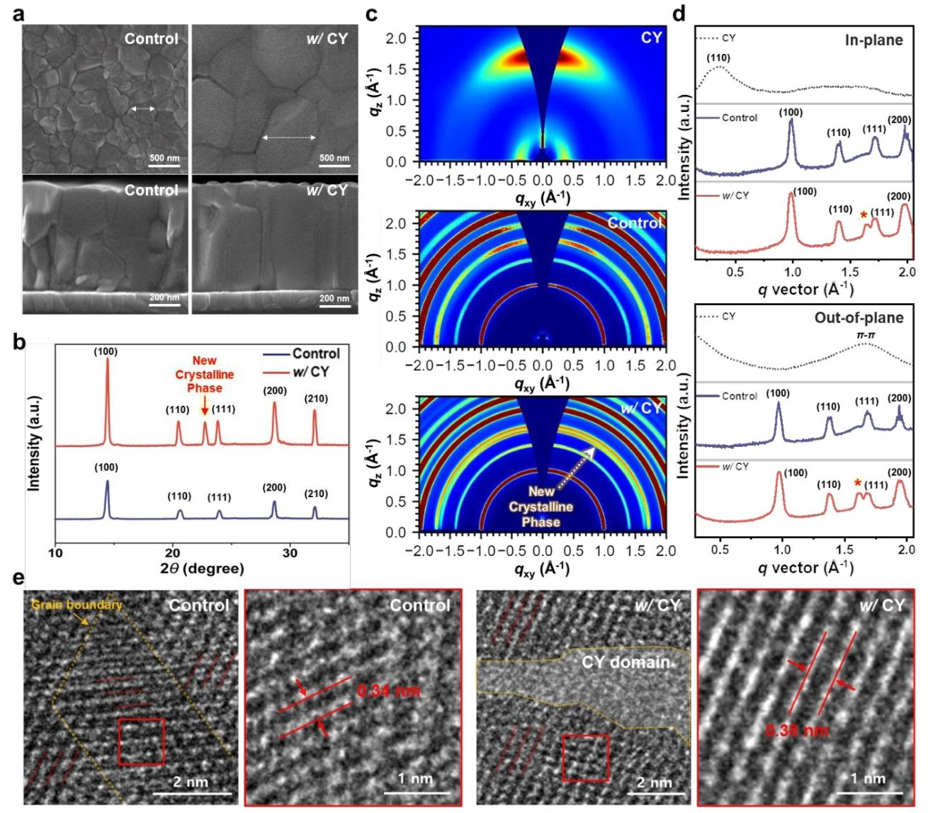 图 3.(a)对照组和掺入 CY 的钙钛矿薄膜的俯视图(上)和横截面图(下)的扫描电子显微镜(SEM)图像。(b)对照组和掺入 CY 的钙钛矿薄膜的 X 射线衍射(XRD)图谱。(c)纯 CY、对照组钙钛矿和掺入 CY 的钙钛矿薄膜的二维掠入射广角 X 射线散射(GIWAXS)图像,(d)及其相应的线切割谱图。(e)对照组和掺入 CY 的钙钛矿薄膜的高分辨率透射电子显微镜(TEM)图像(红色方框中的放大图像)