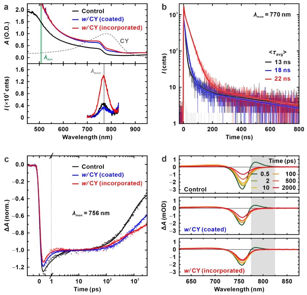 电荷传输:优化能级匹配,提升载流子迁移率,延长激子寿命(CY 掺入膜为 22±2 ns,对照为 13±1 ns)。
