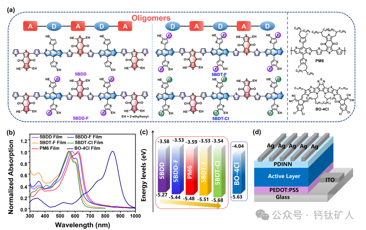 图1. a)分子结构,B)膜中低聚物、PM 6和BO-4 Cl的吸收光谱,c)纯膜中5 BDD、5 BDD-F、5 BDT-F、5 BDT-Cl、PM 6和BO-4 Cl的能级,d)常规器件结构的示意图。