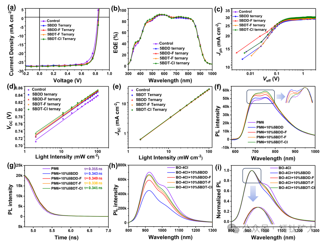 图2. a)J-V曲线和B)对照、基于5 BDD-、5 BDD-F-、5 BDT-F-、5 BDT-Cl-的三元器件的EQE曲线。c)相应优化的太阳能电池中的Jph对Veff的曲线。d)相应优化的太阳能电池的Plight对JSC的依赖性。e)相应优化的太阳能电池的Plight对VOC的依赖性。f)PM 6纯膜的PL光谱,g)PM 6纯膜和具有不同10%低聚物共混物膜的PM 6的TRPL光谱。h)BO-4Cl纯膜和具有不同10%低聚物共混物膜的BO-4Cl的PL光谱。i)BO-4Cl纯膜和具有不同10%低聚物共混物膜的BO-4Cl的归一化PL光谱。