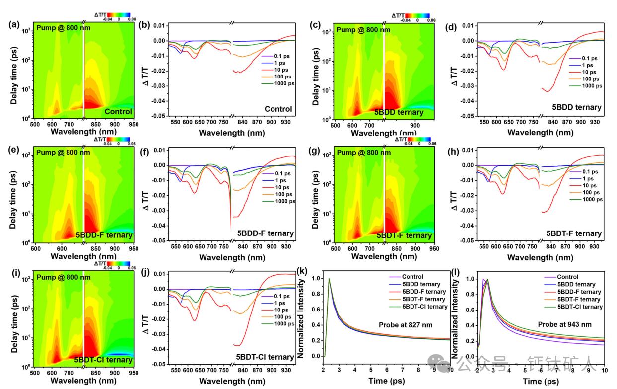 图3. a,c,e,g,i)在800 nm激发下,在10 μJ cm-2以下的能量密度下,在指示的延迟时间下,对照的基于低聚物的三元共混物的fs-TA光谱的2D彩色图。B,d,f,h,j)在指示的延迟时间下,对照的基于低聚物的三元共混物的fs-TA光谱。g)具有相应共混物膜的单激子的寿命。h)具有相应共混物膜的极化子产生动力学。