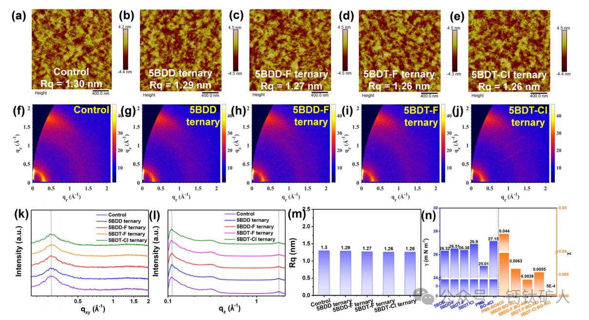 图4. f)对照,g)5 BDD基三元膜,h)5 BDD-F基三元膜,i)5 BDT-F基三元膜,和j)5 BDT-Cl基三元膜。1D线沿沿着k)相应膜的面内和l)面外切割。m)相应共混膜的RMS值。n)相应