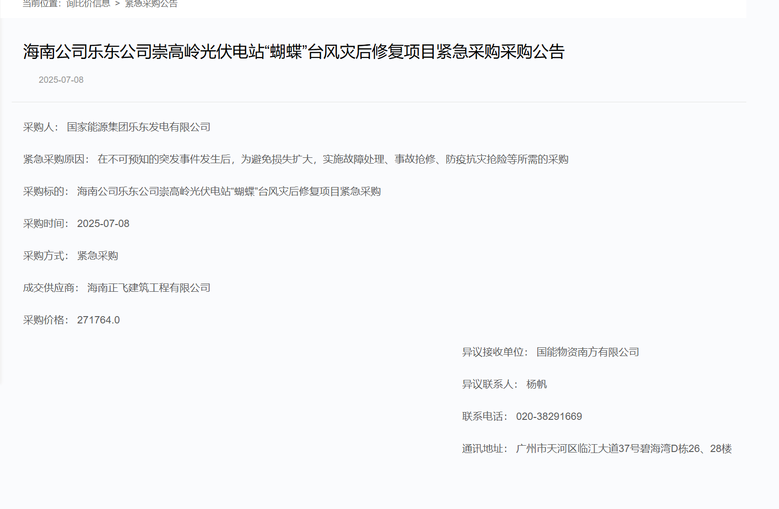 7月8日,国家能源集团海南公司乐东公司发布崇高岭光伏电站“蝴蝶”台风灾后修复项目紧急采购采购。