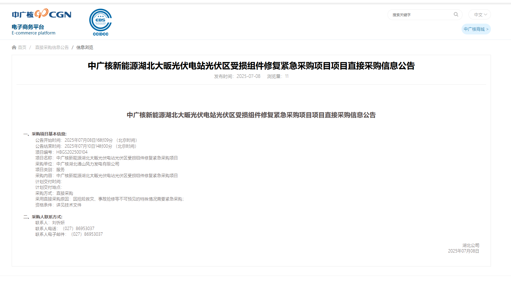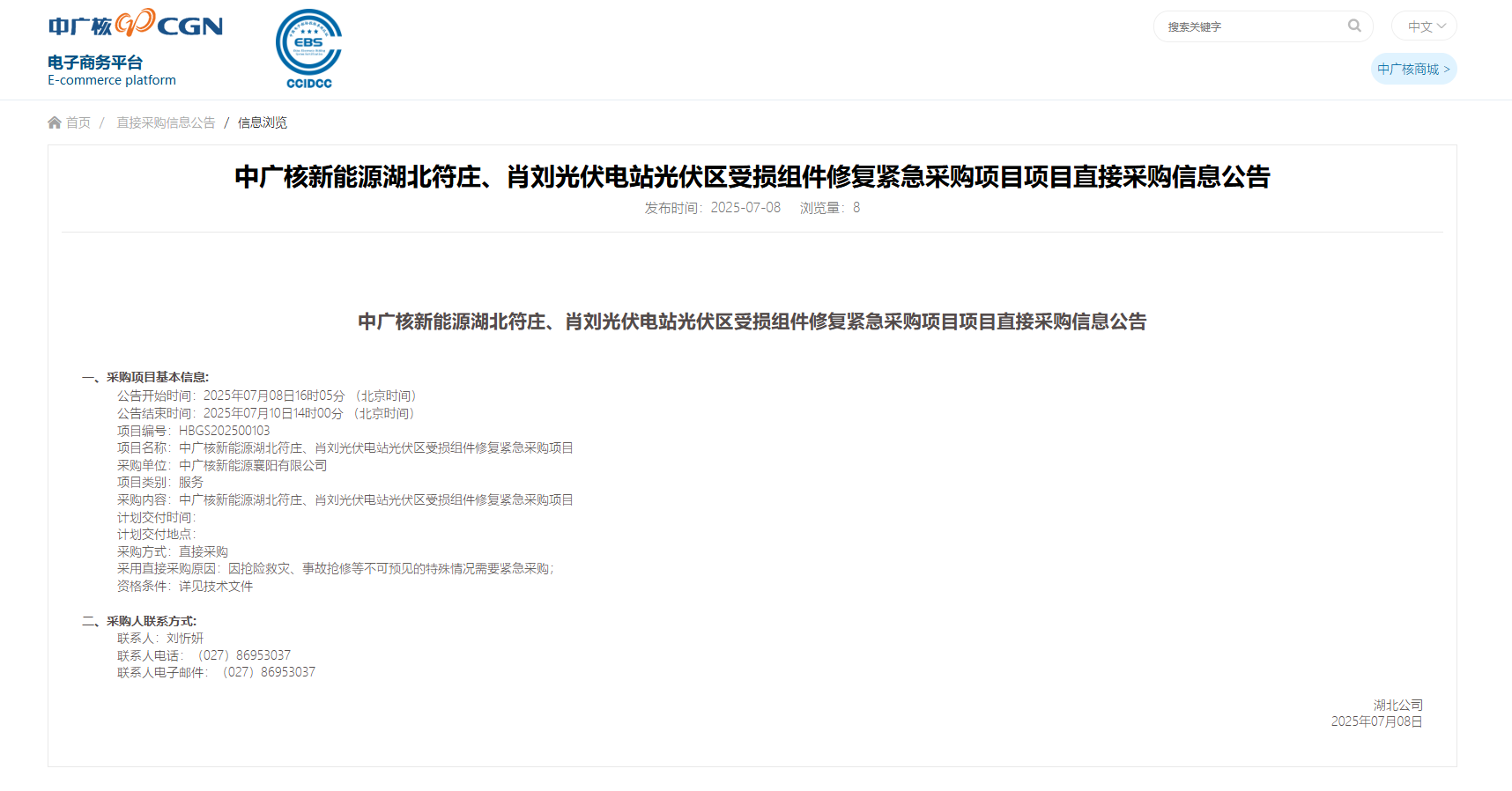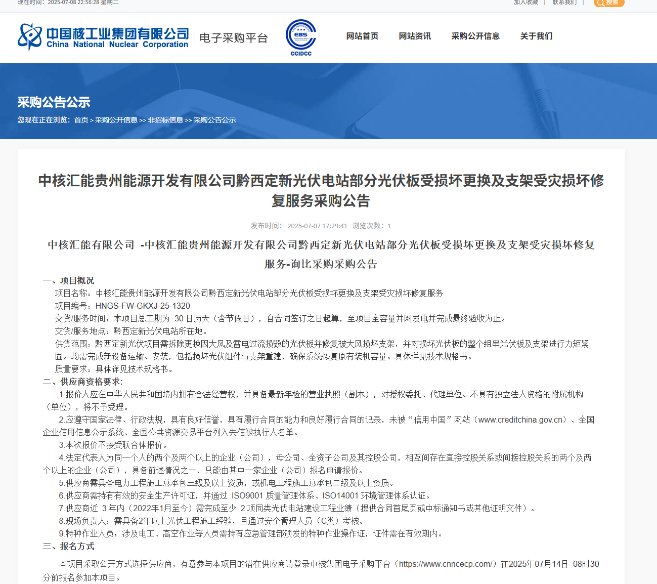 需要指出是,中广核新能源湖北大畈、湖北符庄、肖刘光伏电站也发布了光伏区受损组件修复紧急采;中核汇能贵州能源开发有限公司则发布了黔西定新光伏电站部分光伏板受损坏更换及支架受灾损坏修复服务采购公告。