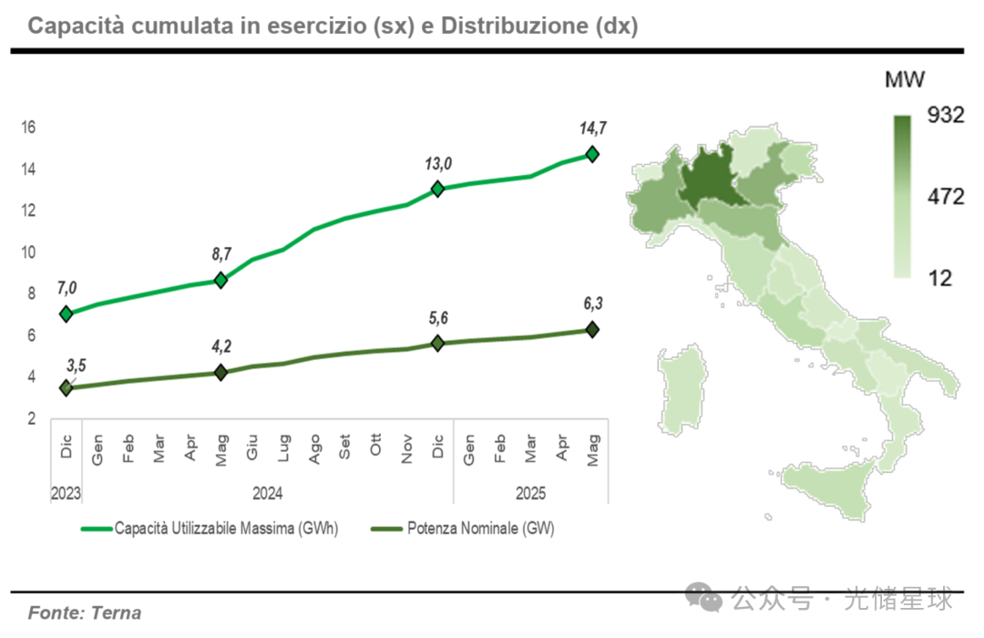 光储星球获悉,根据意大利国家电网运营商Terna近日发布的电力系统月度报告,新增装机功率虽有回落,但整体装机规模与储能容量仍呈增长态势。