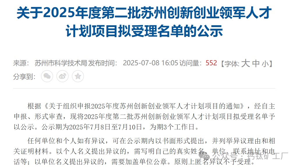 2025年7月8日,苏州市科技局就关于2025年度第二批苏州创新创业领军人才计划项目拟受理名单进行公示。公示期为2025年7月8日至7月10日,为期3个工作日。名单项目总计587个,其中,钙钛矿相关项目9个。