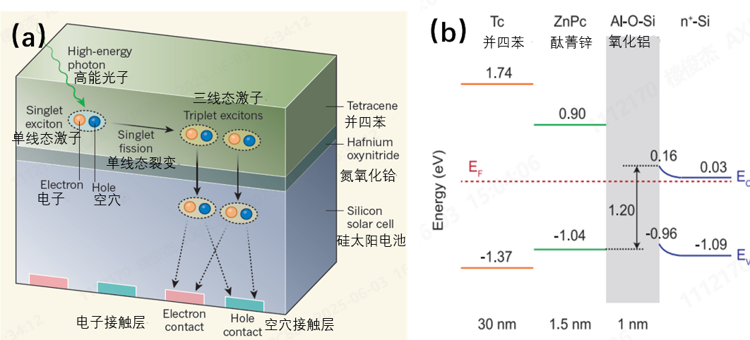 Dexter[9]。超薄膜层能实现有效激子转移,但往往无法实现对晶硅等半导体的有效钝化。Einzinger等工作的亮点在于发现了HfOxNy这种有效的超薄钝化层。虽然Einzinger等制备的太阳电池效率不高,有许多需要优化的部分,但该工作为我们展现了激子倍增材料敏化BC电池巨大的应用潜力(理论效率35%)[10]。2025年5月,Baldo等进一步优化了激子倍增材料敏化晶硅电池结构,相关文章发表在Joule上[11]。该工作的亮点是在并四苯和硅之间引入氧化铝(AlOx)和酞菁锌(ZnPc)。N型硅的导带底和ZnPc的最高分子占据轨道组成的电荷分离态能量为1.2