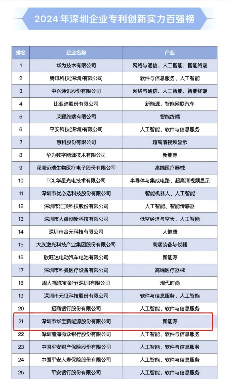 近期,深圳市市场监督管理局发布《2024年深圳企业专利创新实力百强榜》,华为、腾讯等科技龙头延续技术领跑优势,新能源、人工智能等新兴产业集群则以专利布局展现创新势能。其中,华宝新能位列榜单第21位,并同步获评“深圳市知识产权领军企业”,截至2025年第一季度全球专利申请量已突破1720项,成为新能源赛道技术深耕的典型样本。