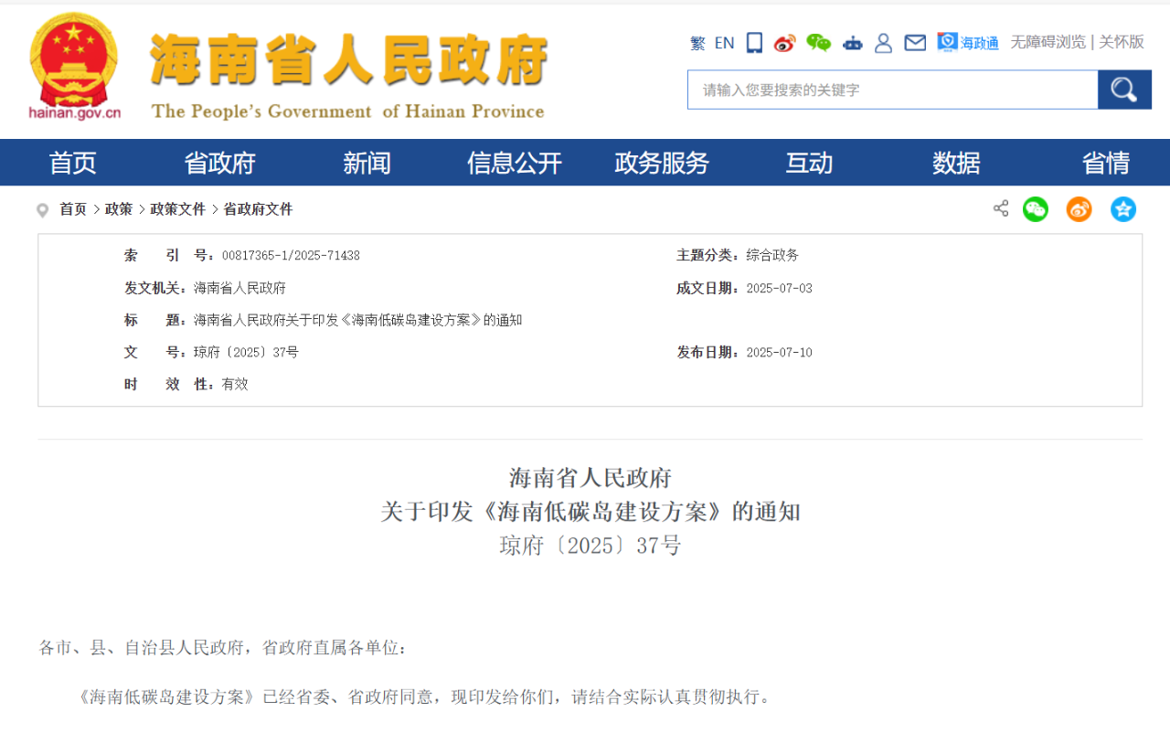 海南省人民政府关于印发《海南低碳岛建设方案》的通知琼府〔2025〕37号