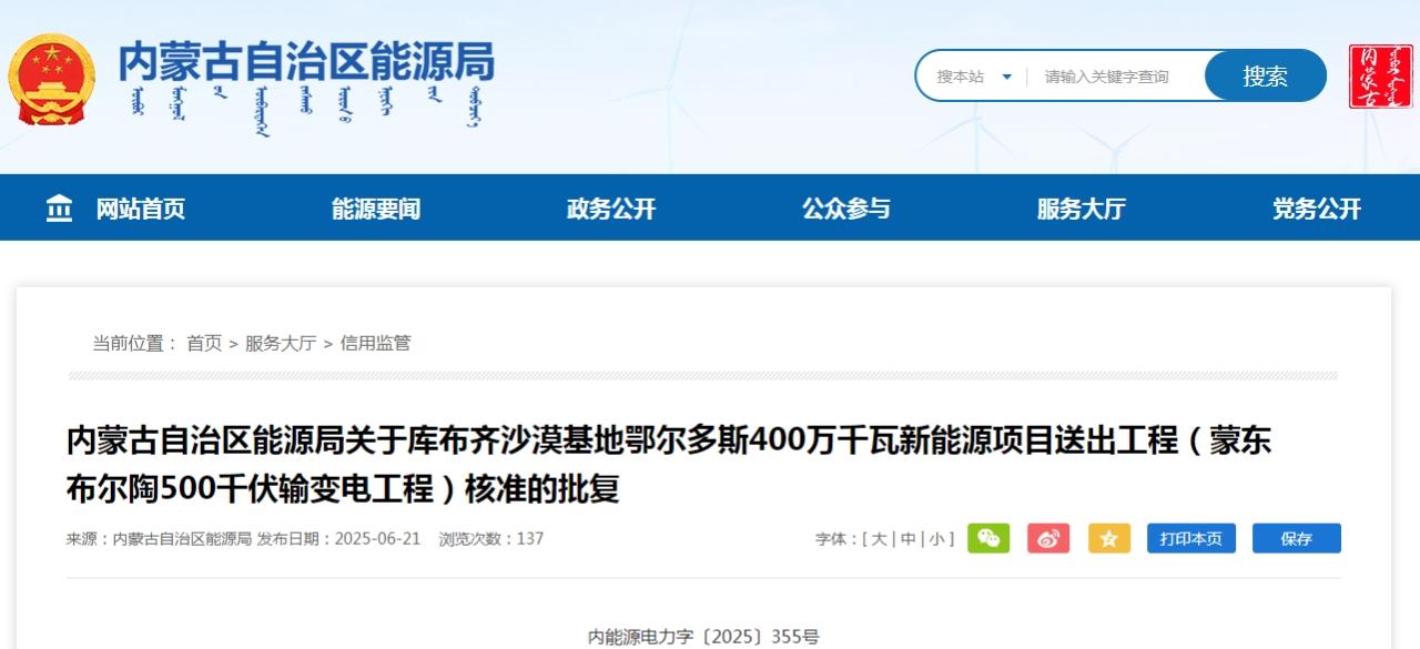 你公司《关于核准库布齐沙漠基地鄂尔多斯400万千瓦新能源项目送出工程(蒙东布尔陶500千伏输变电工程)的请示》(蒙东电报〔2025〕475号)及有关材料收悉。经研究,现就该核准事项批复如下。