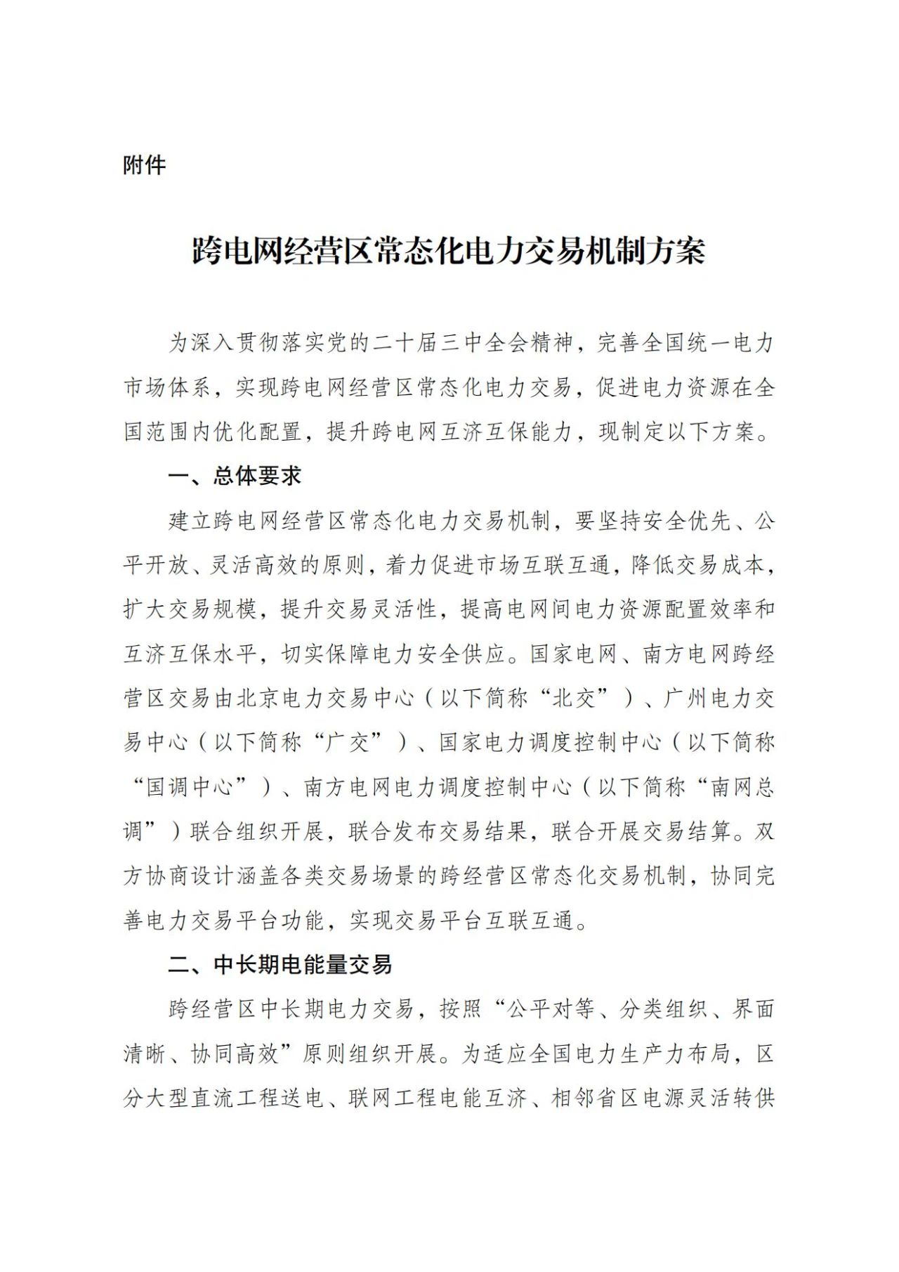 二、实现跨电网经营区常态化交易,是贯彻落实党的二十届三中全会精神、建设全国统一电力市场的标志性举措,对打破市场分割和地区封锁、在全国范围内优化电力资源配置具有重要意义。国家电网公司、南方电网公司要进一步深化合作,充分发挥跨电网经营区常态化交易机制作用,促进电力市场互联互通,提升网间通道利用效率,强化各层次市场的衔接协同,保障全国统一电力市场体系高效运行。