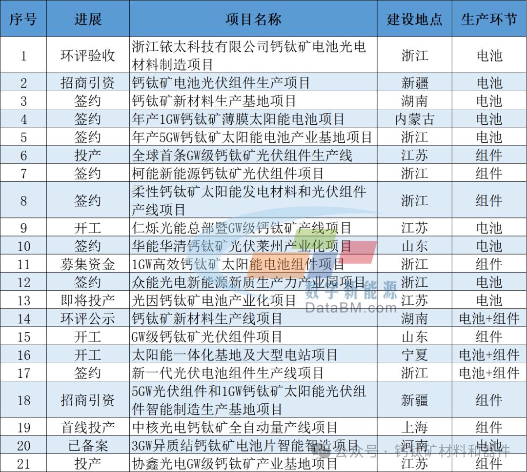 据不完全统计,今年上半年已有 21 个光伏钙钛矿制造项目完成动态更新,多数处于备案、签约、开工等前期阶段,其中新签约项目达 8