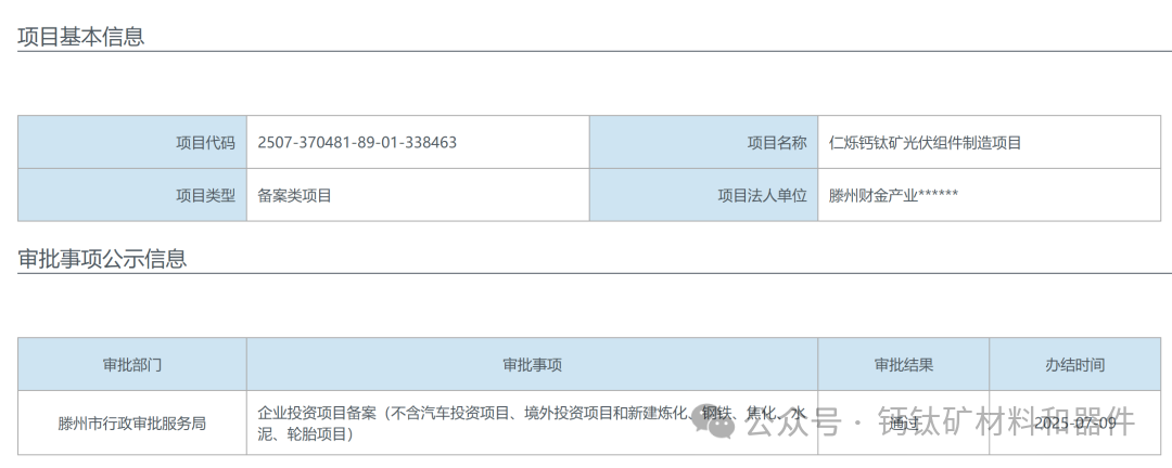 7 月 9 日,山东省投资项目在线审批监管平台信息显示,仁烁钙钛矿光伏组件制造项目由滕州财金产业投资发展有限公司主导完成备案。