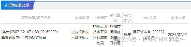 近期,钙钛矿领域再添新员:7 月 1 日,江苏省投资项目在线审批监管平台显示,晶澳研发中心 4 号钙钛矿项目完成备案;