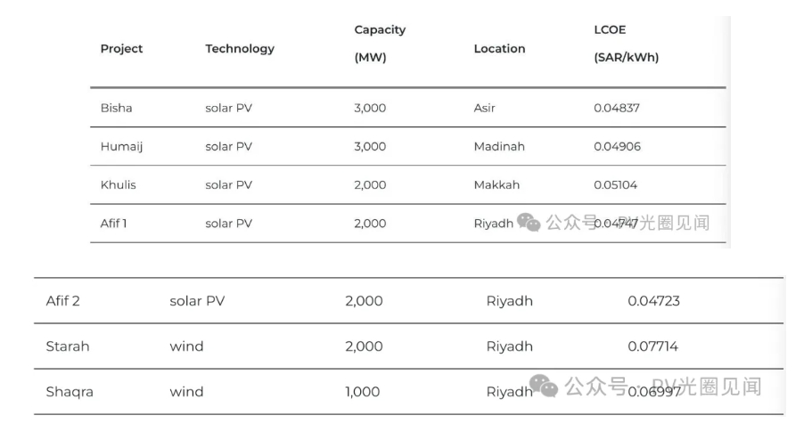 风电项目包括:利雅得地区斯塔拉项目:装机容量2,000兆瓦,LCOE为7.71422哈拉拉/千瓦时(2.05712美分);利雅得地区舍格拉项目:装机容量1,000兆瓦,LCOE为6.99750哈拉拉/千瓦时(1.86600美分)。