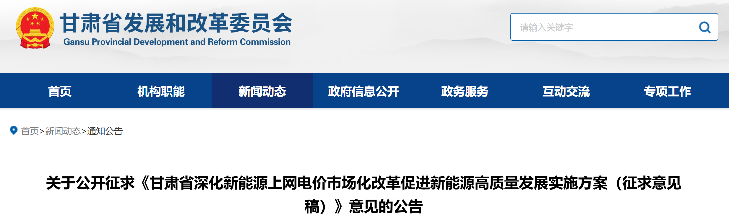 7月14日,甘肃省发改委下发《甘肃省深化新能源上网电价市场化改革促进新能源高质量发展实施方案(征求意见稿)》,现面向社会公开征求意见。