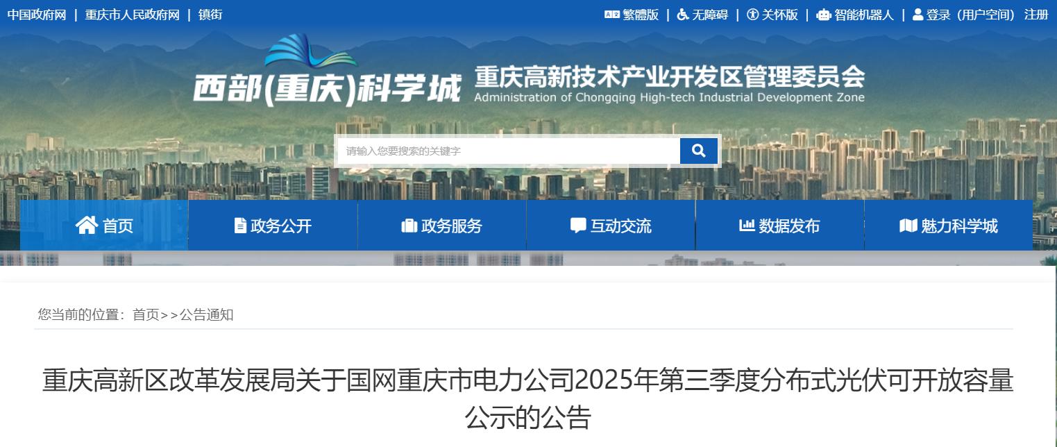 7月11日,重庆高新区改革发展局关于国网重庆市电力公司2025年第三季度分布式光伏可开放容量公示的公告,根据公告,重庆市2025年第三季度分布式光伏可开放容量为8474.192MW。公告显示重庆222个变电站,评估等级全部为绿色。在查询可开放容量时,除关注分布式电源项目所接入电压等级的电网设备可开放容量以外,还应重点关注所属上一级线路或变电站的可开放容量,防止因上级电网可开放容量不足导致接入受限。此外,本可开放容量信息公示日之后供电公司新受理并网申请的分布式电源项目,也将影响剩余可开放容量。