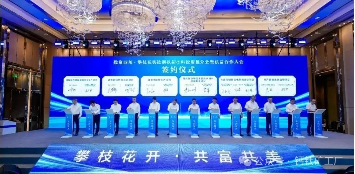 5月24日,投资四川·攀枝花钒钛钢铁新材料投资推介会暨供需合作大会在蓉举行,在现场的签约仪式上,米易县与浙江钙欧新能源科技有限公司签署了百兆瓦级新型钙钛矿薄膜光伏组件及其配套项目合作协议,该项目总投资约20亿元,分两期建设,项目建成投产后将有力推动米易抢占新型薄膜光伏组件产业化发展先机,填补高端光伏组件布局的空白,助力米易加快发展新质生产力。