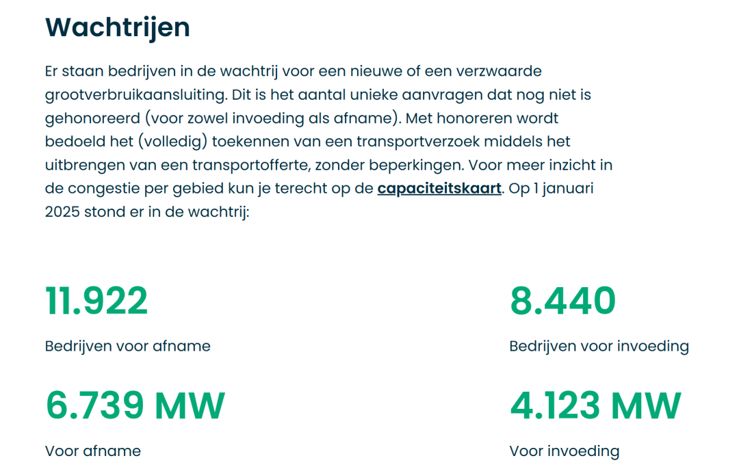 根据荷兰电网管理协会(Netbeheer Nederland)的数据,截至2025年1月1日的排队情况,11,922个项目正在等待并网,总功率为6,739