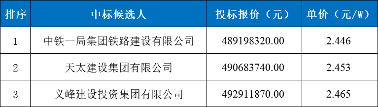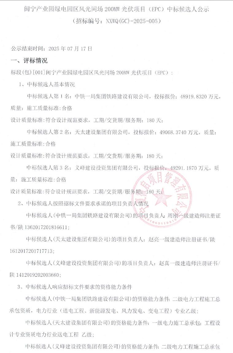 从中标公告来看:投标报价为2.446~2.465元/W。其中,中铁一局集团铁路建设有限公司获得第一中标候选人,投标报价2.446元/W,具体情况如下:表:闽宁产业园绿电园区风光同场200MW光伏项目(EPC)中标候选人