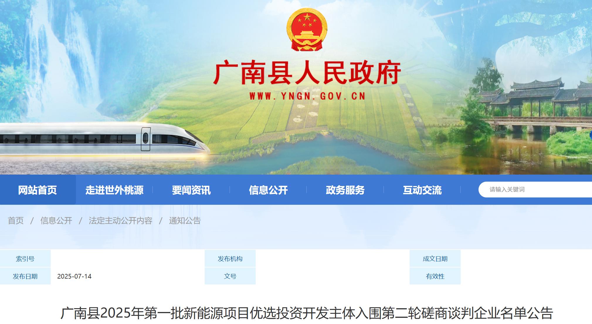 7月14日,云南省广南县人民政府发布广南县2025年第一批新能源项目优选投资开发主体入围第二轮磋商谈判企业名单公告。根据第一轮书面优选测评结果,进入第二轮磋商谈判企业名单公告如下: