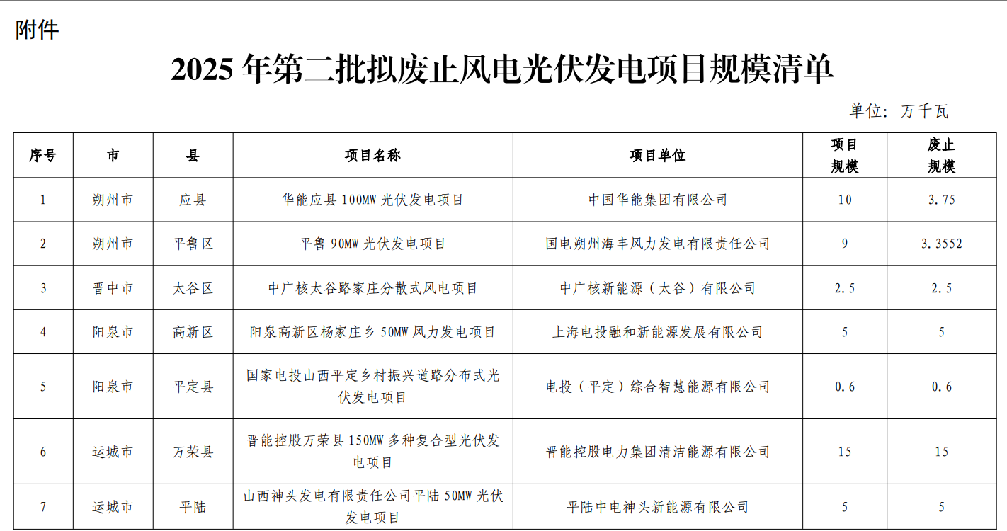 7月14日,山西能源局发布《关于公示2025年第二批拟废止风电光伏发电项目规模的清单》,拟将471MW风光项目调整至119MW,合计废止风光项目352.052MW。4月28日,山西第一批已经废止591.947MW风光项目,加上第二批的项目,今年合计废止了944MW风、光项目。1、此次废止项目的情况从废止项目公示清单来看,共包含7个风光项目,规模352.052MW。其中,光伏项目5个,约277MW;风电项目2个,约75MW。