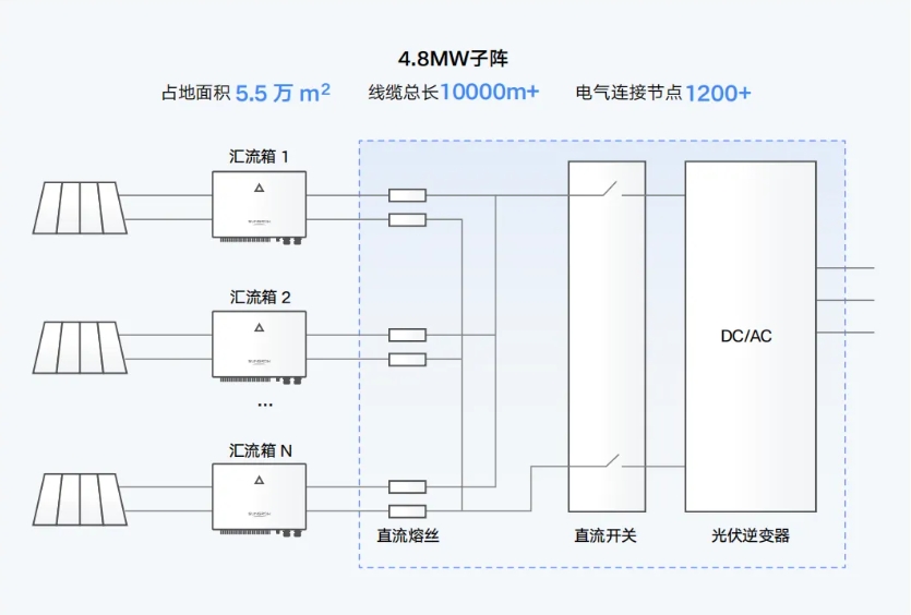 这一现象有其内在必然性。阳光电源地面光伏组串式产品总监李文浩指出,作为能量汇集与传输的枢纽,直流侧由组件、逆变器、汇流箱等设备构成,具有接线复杂、设备长期暴露于户外环境的典型特征,面临较高的运行安全风险。以典型4.8MW光伏子阵为例,其电气系统包含610根传输线缆、超过1200个电气连接节点,线缆总敷设长度逾10公里,复杂的物理结构与规模化部署特征,叠加现场施工工艺标准化不足、运维人员技术水平差异等因素客观上决定了直流侧成为系统故障的高发区域。