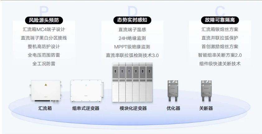 为破解直流侧安全难题,阳光电源在对现有的逆变器、汇流箱等设备安全升级的同时,历经大量技术攻关与工程验证,推出了以“PDC”三阶防控模型(预防Prevent-诊断Diagnose-隔离Contain)为核心的直流安全AI全域管理方案,通过优化器、关断器、汇流箱、逆变器等设备的协同联动,突破了传统被动保护模式的技术局限,实现从隐患预防到故障处置的全生命周期闭环管理。