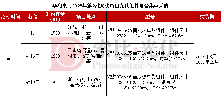 7月1日,华润电力发布2025年第2批光伏项目光伏组件设备集中采购招标公告,项目招标人为华润新能源投资有限公司,开标时间计划2025年7月22日。