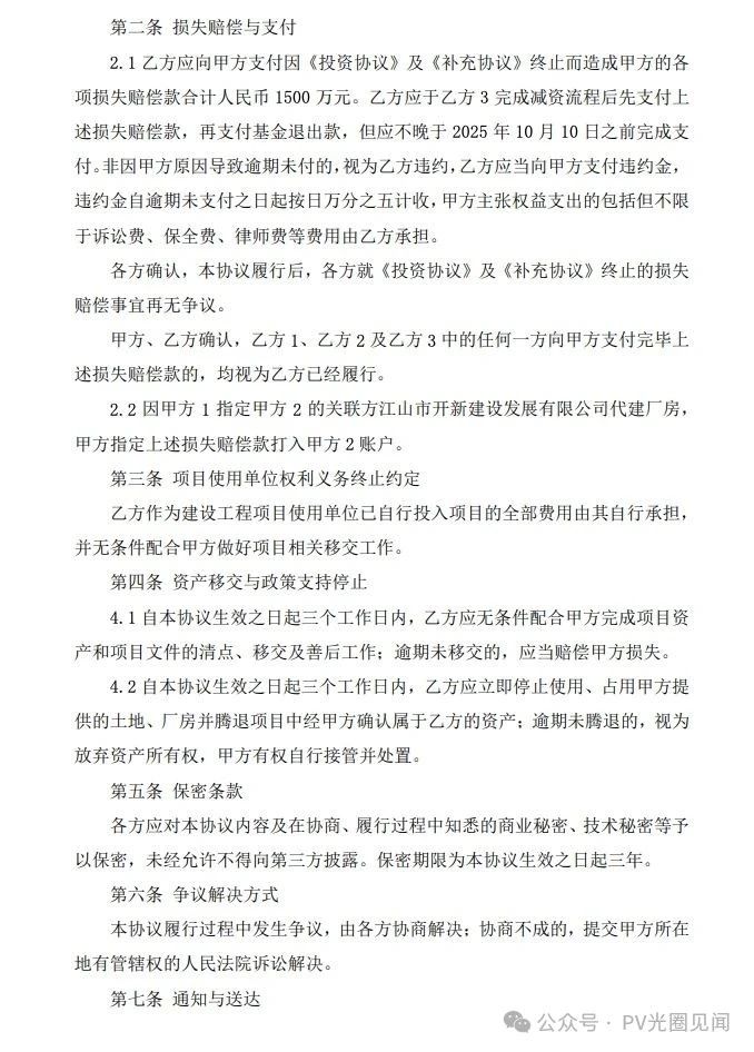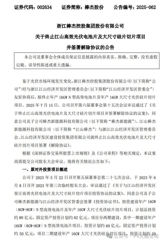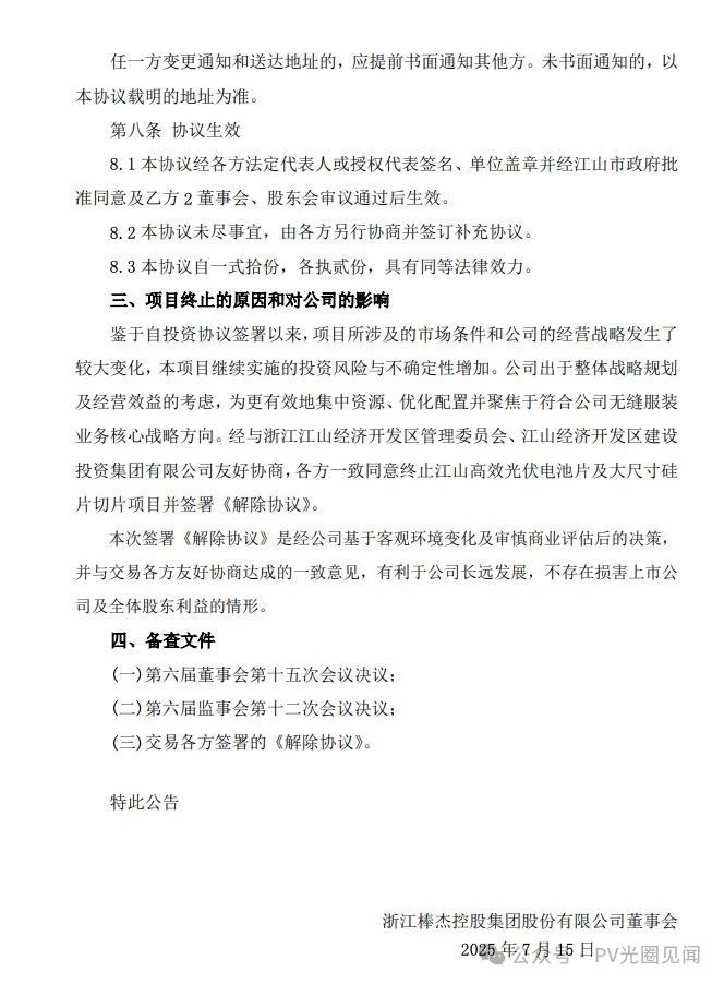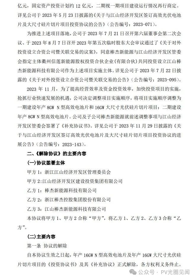 2025年7月15日,公司召开第六届董事会第十五次会议审议通过了《关于终止江山高效光伏电池片及大尺寸硅片切片项目并签署解除协议的议案》,同意公司及子公司棒杰新能源科技有限公司(以下简称“棒杰新能源”)、江山棒杰新能源科技有限公司(以下简称“江山棒杰”)与浙江江山经济开发区管理委员会、江山经济开发区建设投资集团有限公司就终止江山高效光伏电池片及大尺寸硅片切片项目签署《解除协议》。