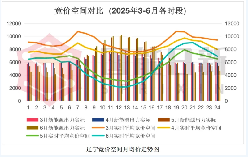 从2025年3月份至6月份来看,辽宁省实际负荷平均值在27000MW至32000MW之间波动,其中3月到4月呈现下降趋势,4月到5月较平稳,5月到6月又呈现上升趋势。相对应地,2025年3-6月份平均新能源实际总出力分别为6492.94MW、6301.03MW、6969.69MW、6402.95MW;3-6月份平均竞价空间分别为9111.71MW、8051.63MW、5631.67MW、5525.99MW。
