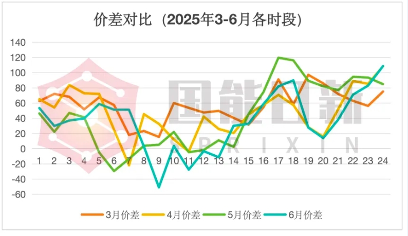 从图中可以看出,辽宁省电力市场价格波动呈现以下几个特征。首先是各月现货电价呈现明显的时段性波动,通常在时段6-8(对应早高峰)、19-21(对应晚高峰)出现当日价格峰值,从5月下旬以后市场竞价空间则明显下降,6月市场电价出现多数值为0的现象,预计7月份负荷会有好转,电价会呈现上涨趋势。第二是季节性差异。辽宁省6月整体电价水平低于3月,与新能源出力增加有关,6月新能源出力实际值普遍高于3月。最后是价差波动方面,各月电价价差呈现较明显的正价差关系,一方面与市场新能源预测普遍预测偏高有关,一方面与市场上调预测曲线有关。