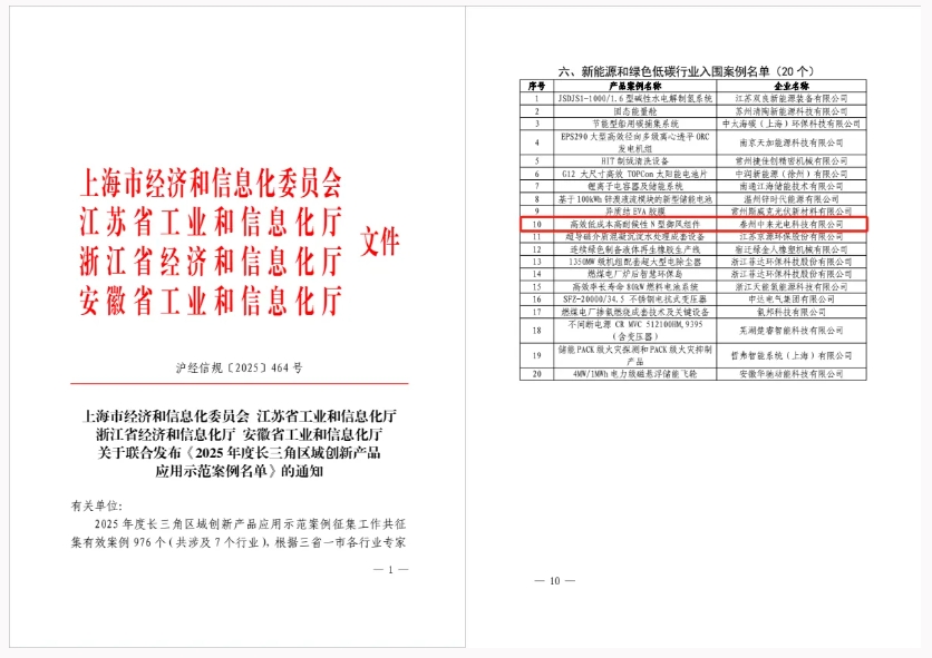 近日,上海市经济和信息化委员会、江苏省工业和信息化厅、浙江省经济和信息化厅、安徽省工业和信息化厅联合发布《2025年度长三角区域创新产品应用示范案例名单》。泰州中来光电科技有限公司研发的“高效低成本高耐候性N型御风组件”凭借其革命性的极端环境耐受能力、卓越的发电性能以及显著的全生命周期价值,成功入选《新能源与绿色低碳行业示范案例》。这份由长三角三省一市官方联合认证的殊荣,不仅是对中来股份技术创新的高度肯定,更是对光伏行业坚守“质量优先”、走高质量发展路径的明确指引。