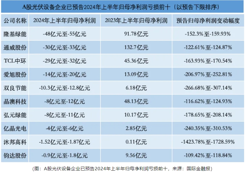多晶硅等多环节价格击破成本线,组件开标价格持续下降,基本在0.7元/W~0.8元/W,造成了全产业链的亏损。半年报中,大多数企业处于净利润亏损状态,且与一季度相比,二季度多数主产业链企业预期亏损加剧。
