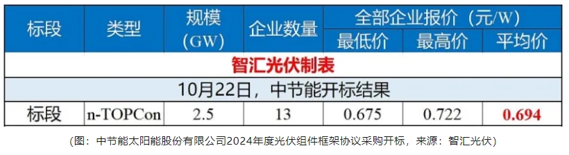 10月,中节能太阳能股份公司2024年度光伏组件框架协议采购开标,13家企业参与投标,均价0.694元/W。同时,从入围结果看,低于0.68元/W的投标单位未能入选。