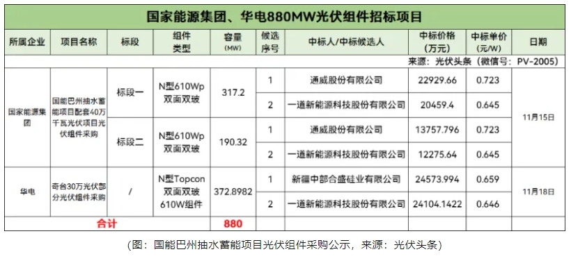 11月,国能巴州抽水蓄能项目光伏组件采购公示,通威以0.723元/W的报价排名第一中标候选人。