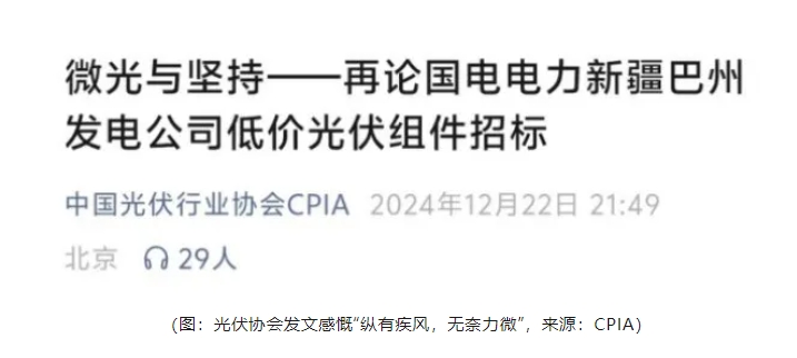 12月22日,协会深夜发布题为《微光与坚持——再论国电电力新疆巴州发电公司低价光伏组件招标》的文章,充满悲情地感慨“纵有疾风,无奈力微”。