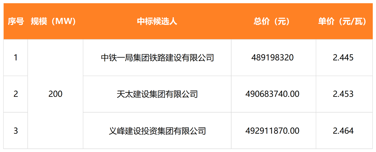 10月5日,武威望舒100兆瓦光伏项目EPC总承包中标候选人公示(见附件)。项目基本情况:项目由甘肃电力投资集团下属的武威望舒新能源科技有限公司投资建设,位于甘肃省武威市凉州区九墩滩腾格里沙漠边缘,新建规模100MW,光伏区系统装机容量为120MWp,配套建设15MW/60MWh储能系统。中国电建集团昆明勘测设计研究院有限公司&中铁十四局集团西北工程有限公司联合体,以21366.9528万元中标,折合单价1.78元/W。中标结果公示招标文件节选