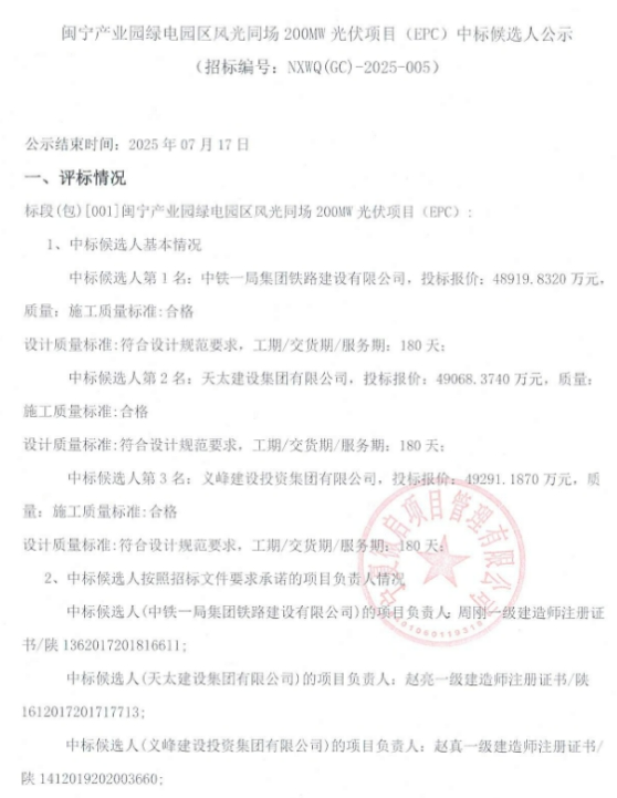 7月14日,闽宁产业园绿电园区风光同场200MW光伏项目(EPC)中标候选人公示。