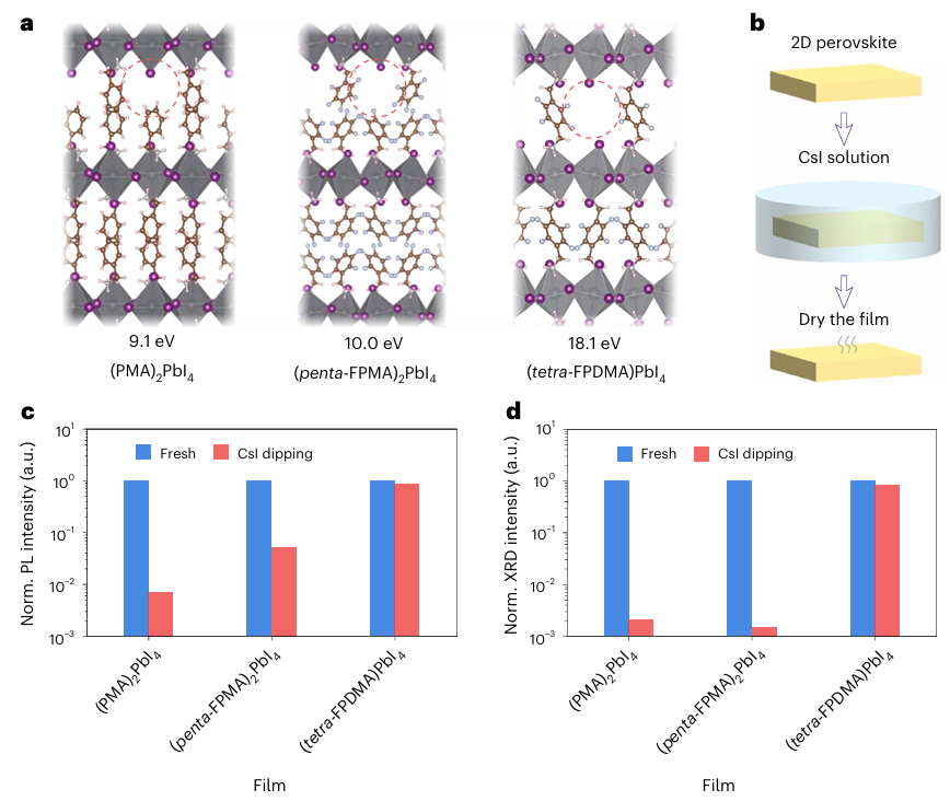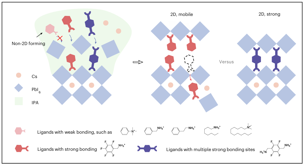 Nazeeruddin等人揭示了无机钙钛矿表面2D/3D异质结构的形成与稳定机制:异质结构的形成主要依赖于铵基与[PbI₆]⁴⁻八面体的相互作用,而其稳定性则取决于整个间隔阳离子与[PbI₆]⁴⁻八面体的结合强度。