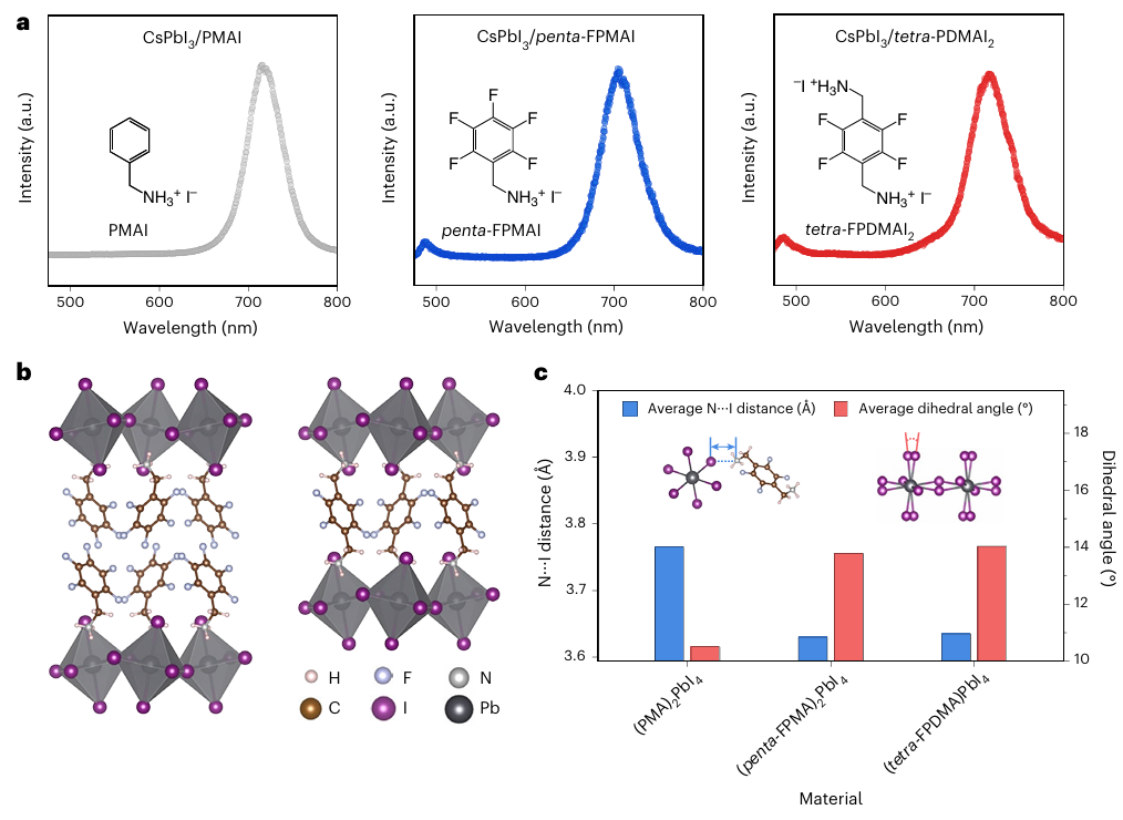 通过引入吸电子氟原子增强铵基的正电荷,促进与Cs⁺的阳离子交换,从而形成异质结构;同时,通过额外锚定基团强化间隔阳离子与[PbI₆]⁴⁻的相互作用,抑制高温下的阳离子迁移。