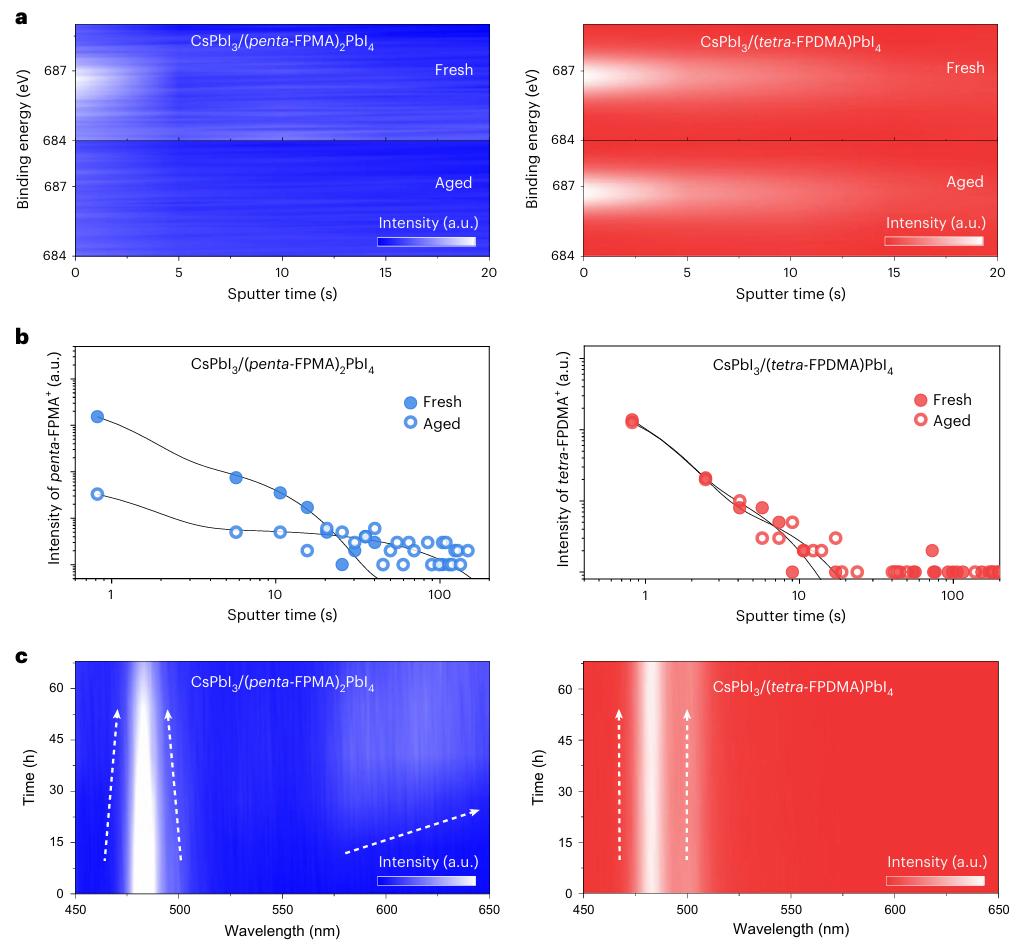材料创新:设计含氟及多锚定基团的间隔阳离子,使异质结构在85°C高温下稳定性提升近8倍(T₈₀达950小时)。