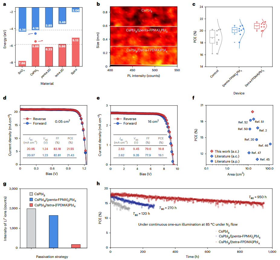 基于此设计的CsPbI₃/(四氟-1,4-亚苯基)二甲烷铵碘化铅异质结构,实现了21.6%的太阳能电池效率和950小时(85°C)的最大功率点运行稳定性,16